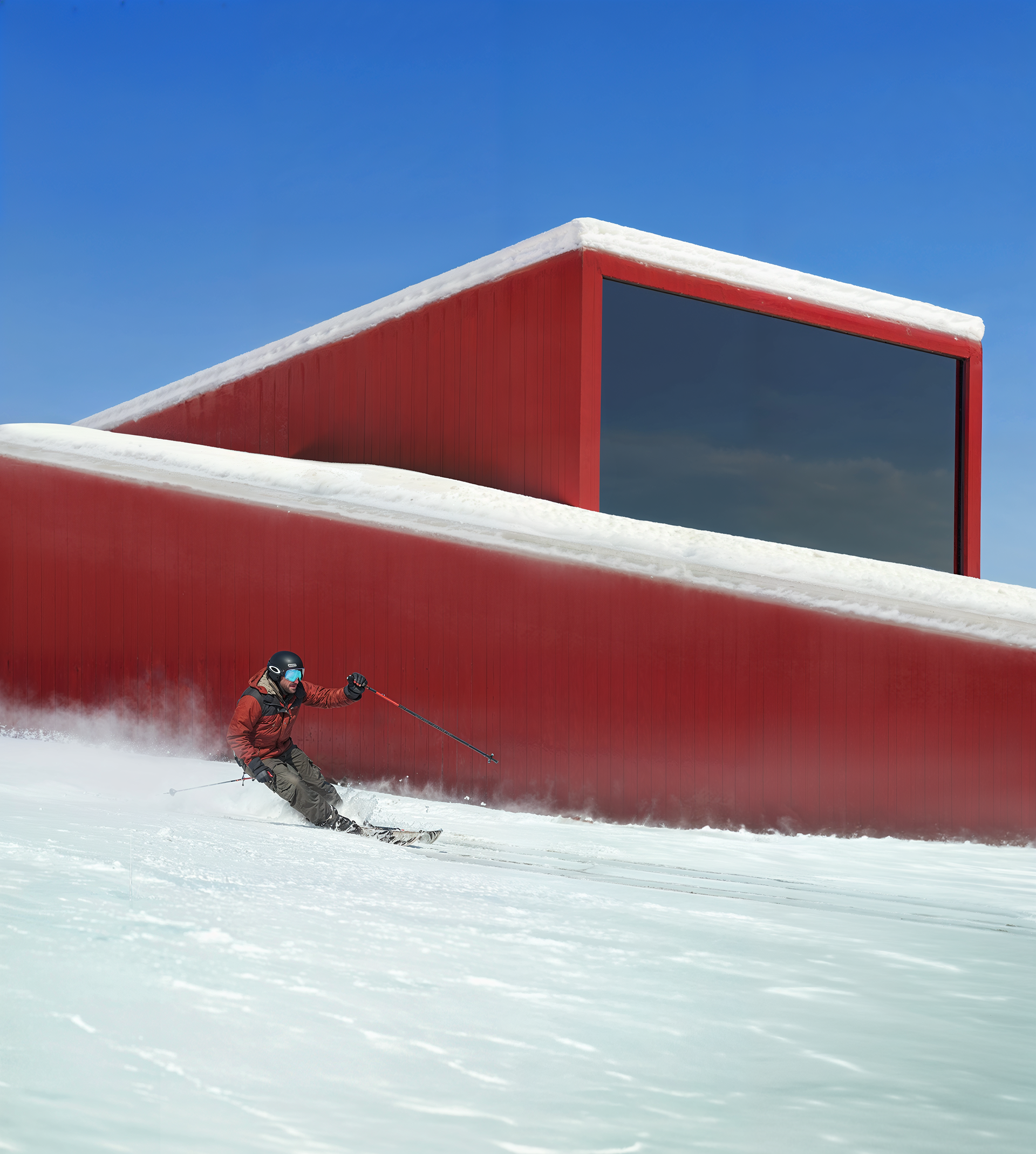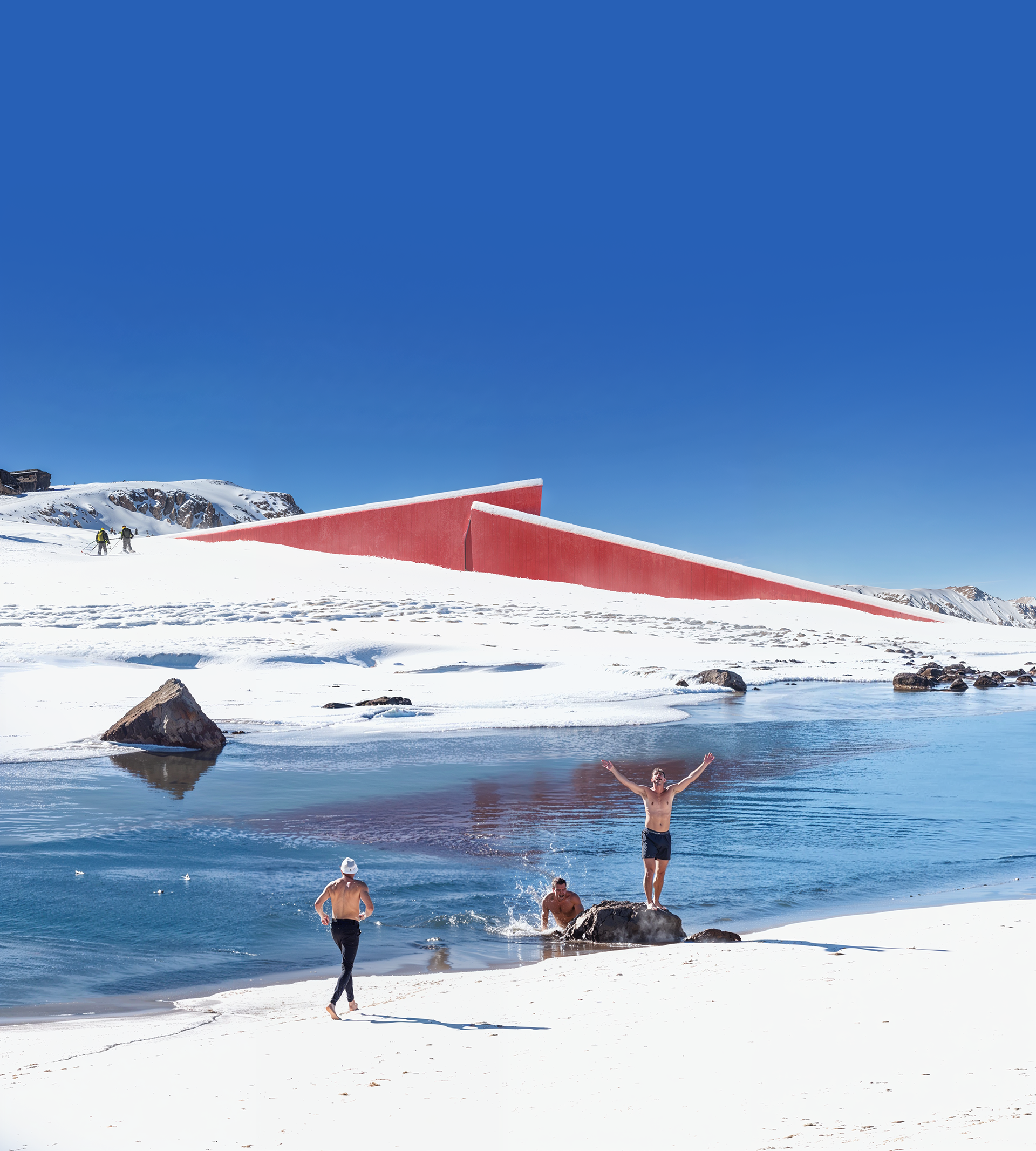 NIVAL, Harmony In Motion. Embracing a sense of tranquility in a symphony of Winter's Grace. Amidst snow-kissed peaks, this architectural gem stands as a testament to elegance and harmony, offering a unique blend of winter and summer activities, including a dip in the icy blue waters.